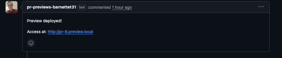I like the direction this tinkering is taking. I think I'm going to expand on it and try to actually deploy the thing that I am opening a PR on to my preview environment, maybe add some monitoring capabilities, and probably a good polling implementation (currently it doesn't ensure the deployment is finished before posting the comment). After that who knows? Maybe I'll push this into a production-like solution, but we will see where this takes me.