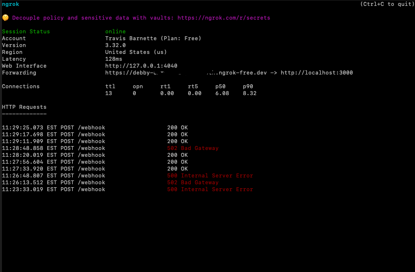 I didn't know this before the project, but you can actually have a GitHub application make a post to a basic web listener whenever actions are taken on a repository that the application is installed on. For the purposes of this project, I created my own app on GitHub and then used ngrok to deliver to my local host project instead of going through all the mess of deploying my Node app this early. Ngrok is just a tool that makes a public URL that can be used as a tunnel to my local dev server. So I can put something like "https://debby-stuff.ngrok-free.dev" into the config for the webhook, and ngrok will automatically redirect traffic to that local server that's running.